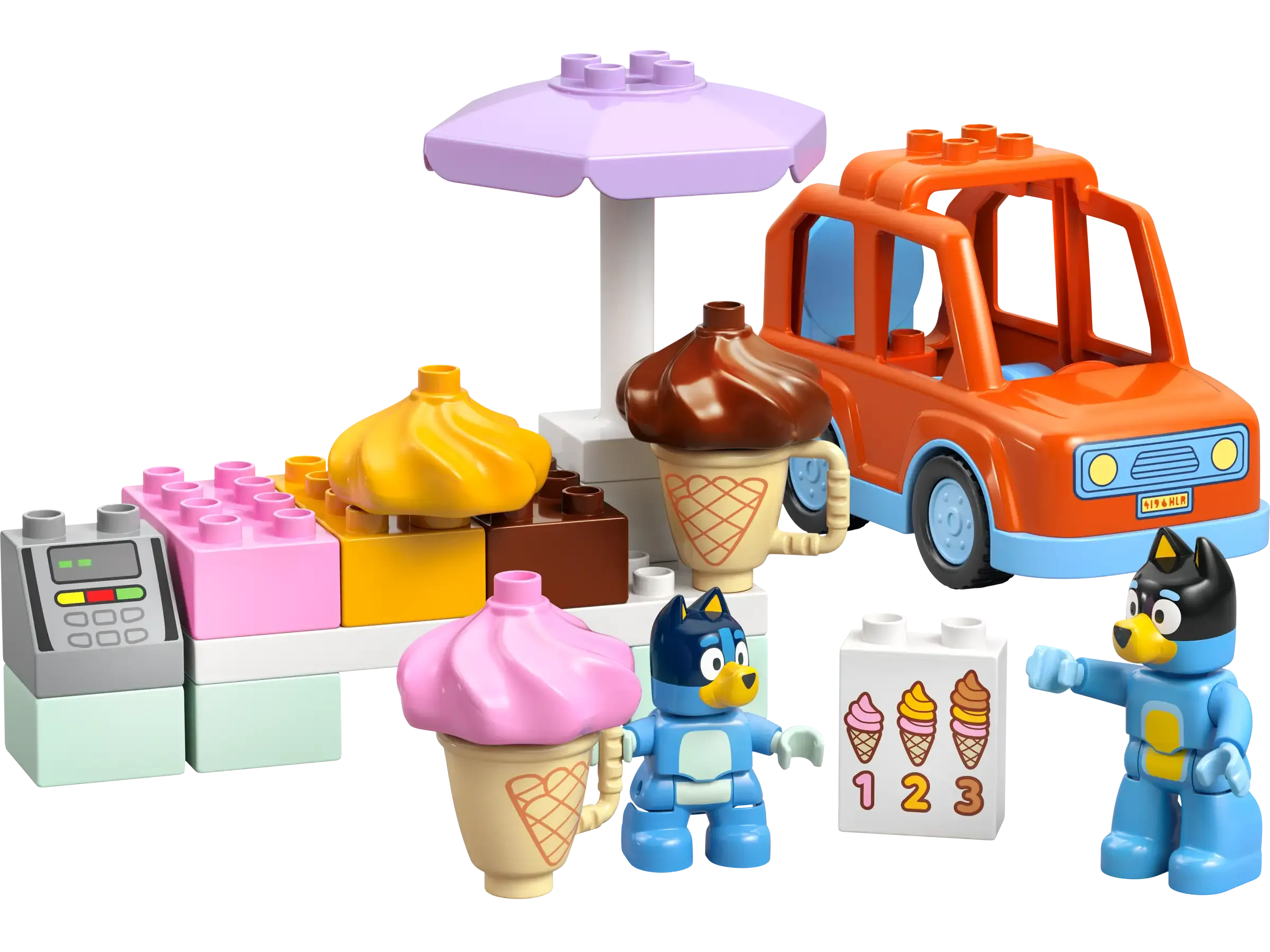 • Σετ παιχνιδιού με περίπτερο παγωτού και όχημα εμπνευσμένο από τη σειρά Bluey – Μεταφέρετε τα παιδιά προσχολικής ηλικίας στον διασκεδαστικό κόσμο της οικογένειας Heeler με το LEGO® DUPLO® Bluey Ice Cream Trip με το παιχνίδι Bluey για νήπια.