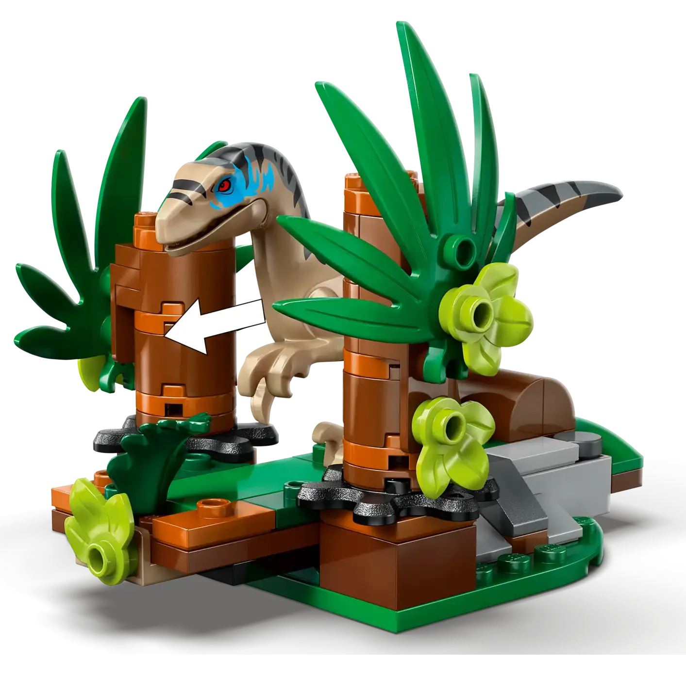 • Λειτουργίες σετ παιχνιδιού δεινοσαύρων – Ο Velociraptor έχει κινητή σιαγόνα και ο θάμνος διαθέτει λειτουργία «έκπληξη» που κάνει τον Velociraptor να «πηδάει» έξω από τον θάμνο όταν πατάτε το κινούμενο τμήμα της βάσης.