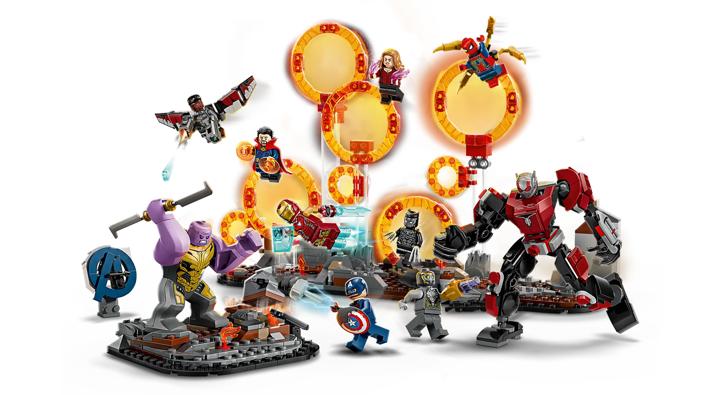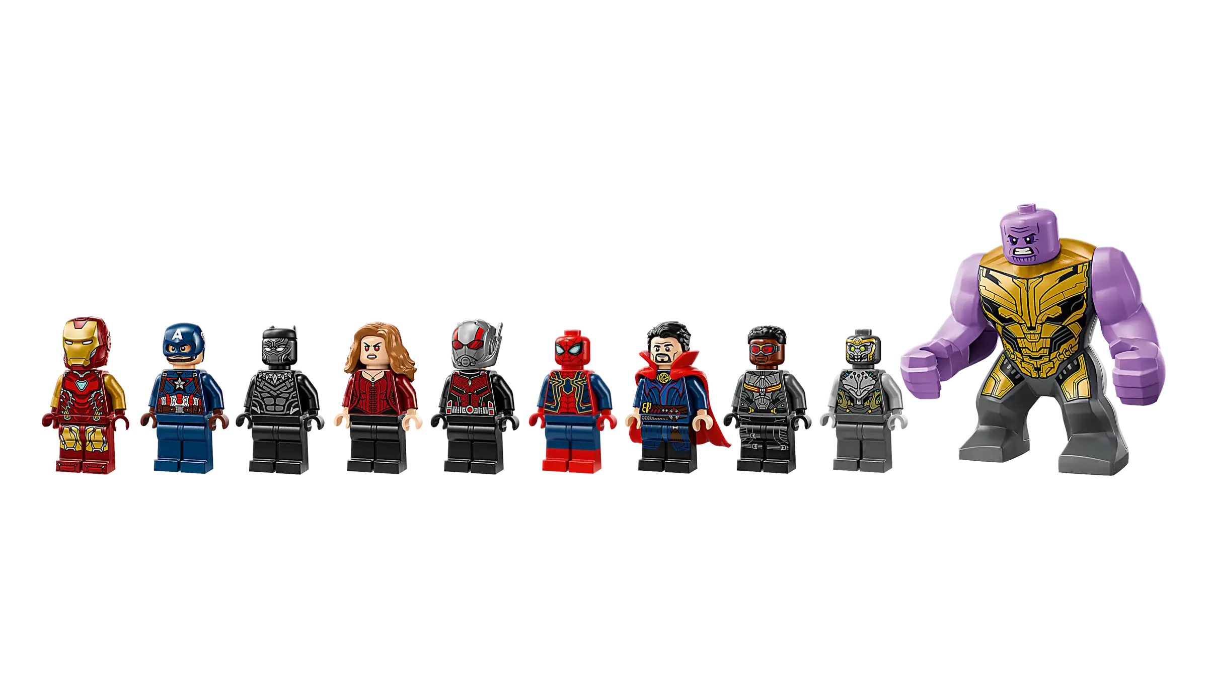 Αναπαράγοντας την επική αναμέτρηση από το Marvel Studios’ Avengers: Endgame, αυτό το σετ παιχνιδιού διαθέτει πύλες διαστάσεων με δαχτυλίδι sling και 9 μινιφιγούρες: Captain America (με ασπίδα), Iron Man MK85 (με σπαθί και ασπίδα), Chitauri (με όπλο στο χέρι), Ant-Man, The Scarlet Witch (με στοιχεία φλόγας), Doctor Strange, Iron Spider (με 4 κινούμενα «πόδια» στην πλάτη), Black Panther και Falcon (με 2 εκτοξευτές). Μια μεγάλη φιγούρα Thanos LEGO, ένας πλήρως αρθρωτός μηχανισμός Ant-Man, 2 λειτουργίες έκρηξης βράχου και ατελείωτες δυνατότητες αναδιαμόρφωσης εξασφαλίζουν δράση Υπερηρώων σε επική κλίμακα. Το σετ περιέχει 621 κομμάτια.