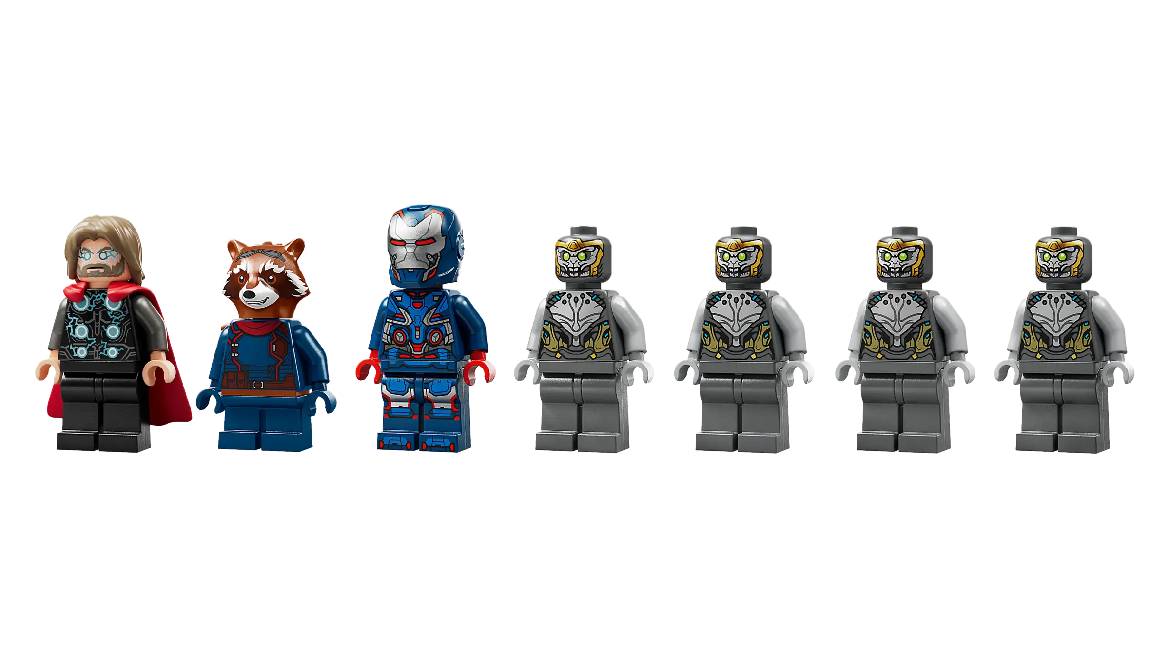 • Μινιφιγούρες LEGO® ǀ Marvel – Υπάρχουν 7 μινιφιγούρες: Iron Patriot MK2; Rocket με μεγάλο βολίδα; Thor με το Stormbreaker; και 4 Chitauri, εκ των οποίων 2 έχουν χρυσές βολίδες.