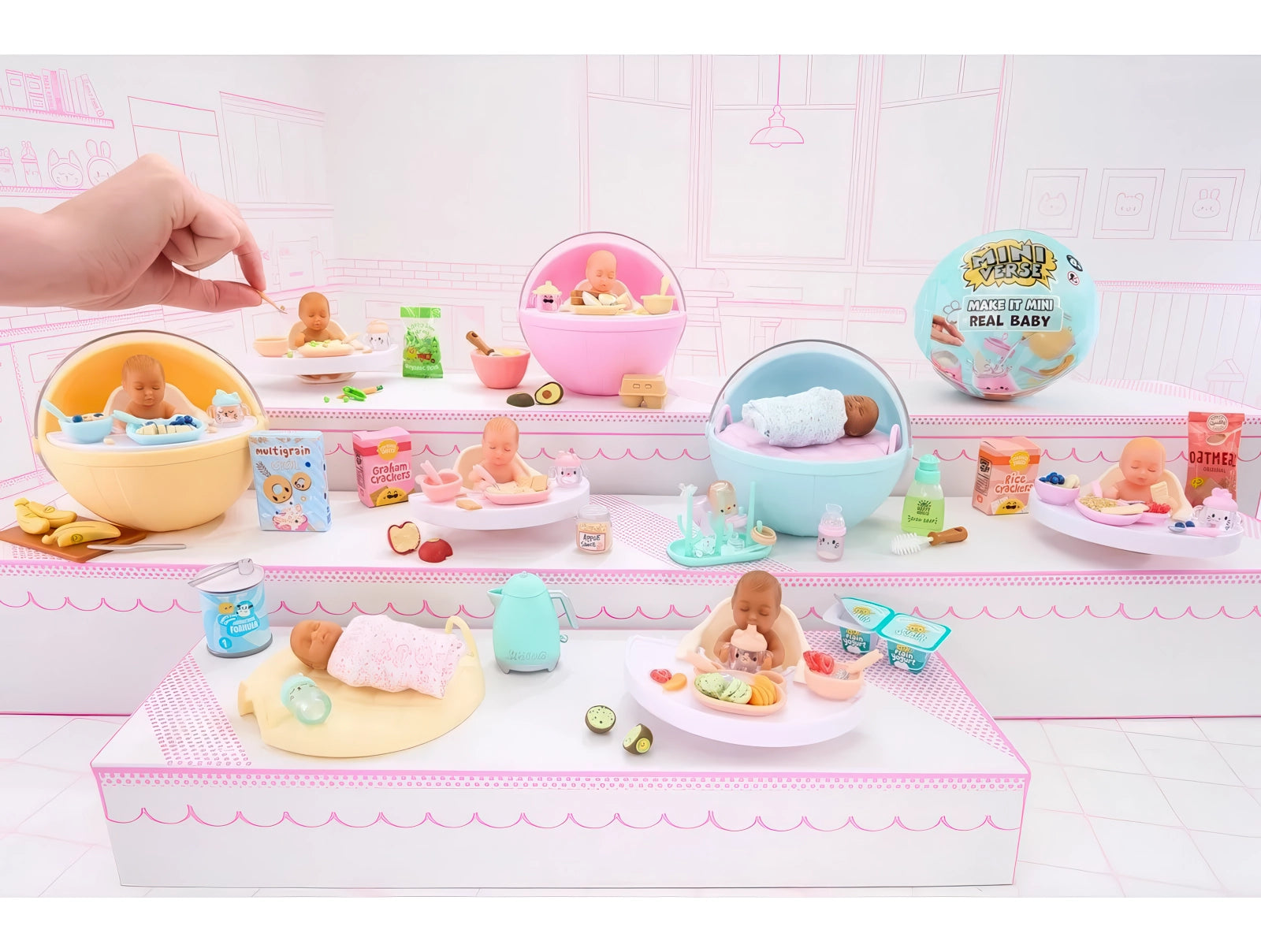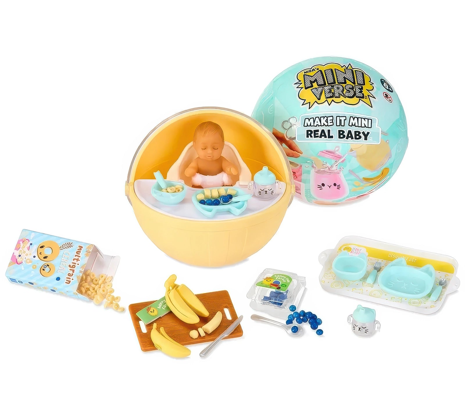 Η σειρά MGA's Miniverse: Make It Mini Real Baby φέρνει τη χαρά της φροντίδας ενός μωρού στον κόσμο των συλλεκτικών minis. Υπάρχουν 8 μοναδικά μωρά, το καθένα με 8 μοναδικές συνταγές μίνι φαγητού για συλλογή (πωλούνται ξεχωριστά). Υπάρχουν χαριτωμένα, ρεαλιστικά μίνι μωρά, καθώς και μίνι συστατικά για να φτιάξετε το φαγητό τους! Από μπιμπερό, πουρέ μήλου, φέτες αβοκάντο και αυγά, κάθε μίνι στιγμή είναι φτιαγμένη για να σας συγκινήσει.