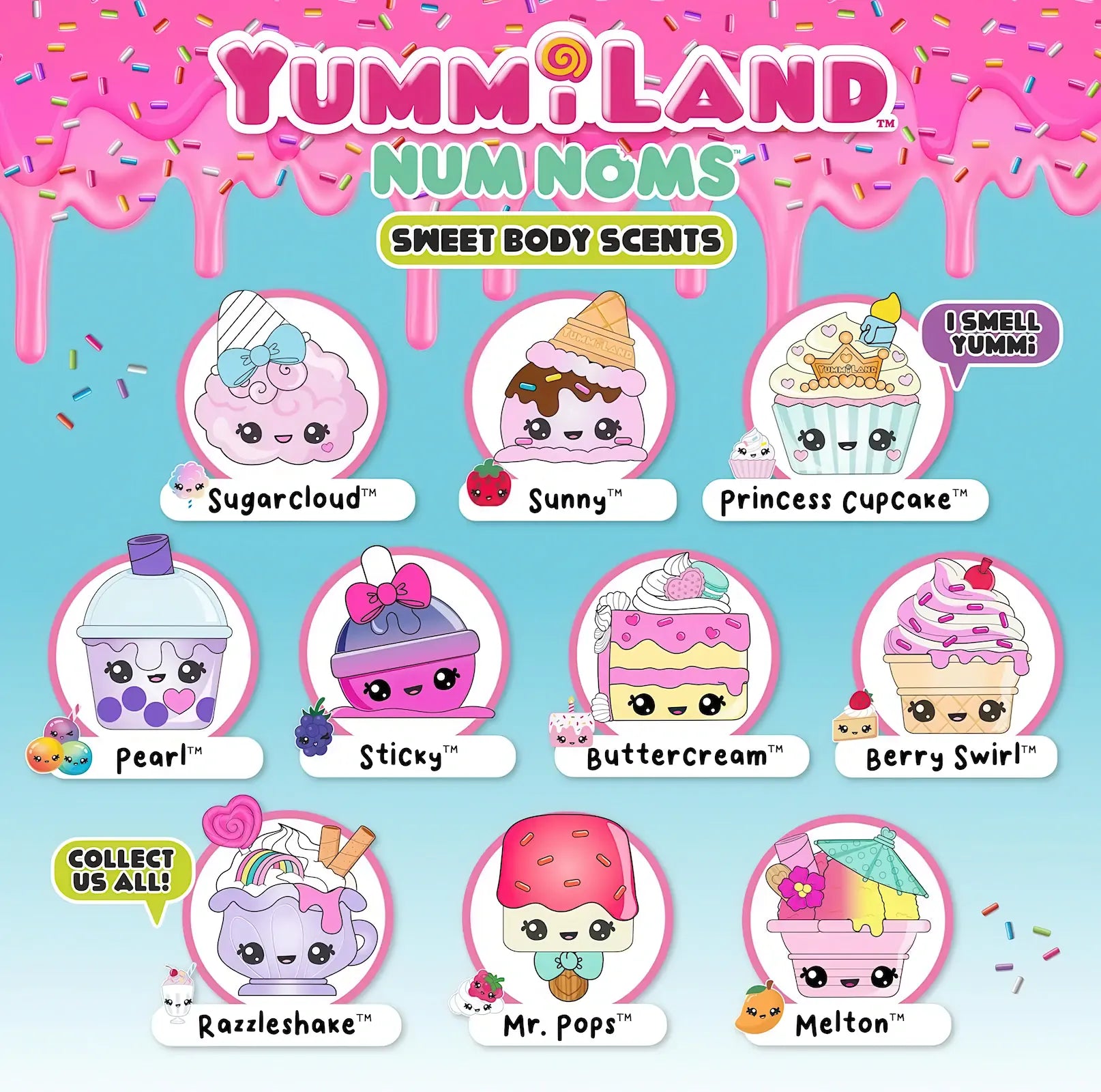 Καλώς ήρθατε στο Yummiland, όπου η διασκέδαση δεν σταματά ποτέ! Γνωρίστε τους χαριτωμένους Num Noms, τώρα με μια πινελιά δημιουργικότητας και αρώματος. Με τη συλλογή Yummiland Num Noms Body Scents, τα παιδιά μπορούν να φτιάξουν τα δικά τους αρώματα σώματος και να τα παίρνουν παντού μαζί τους. Κάθε κλειστή μυστηριώδης συσκευασία περιέχει 1 από 10 μοναδικούς χαρακτήρες Num Noms, ο καθένας με το δικό του υπέροχο άρωμα εμπνευσμένο από φαγητά, όπως τούρτα γενεθλίων, φρούτο του πάθους και βανίλια με βατόμουρο.