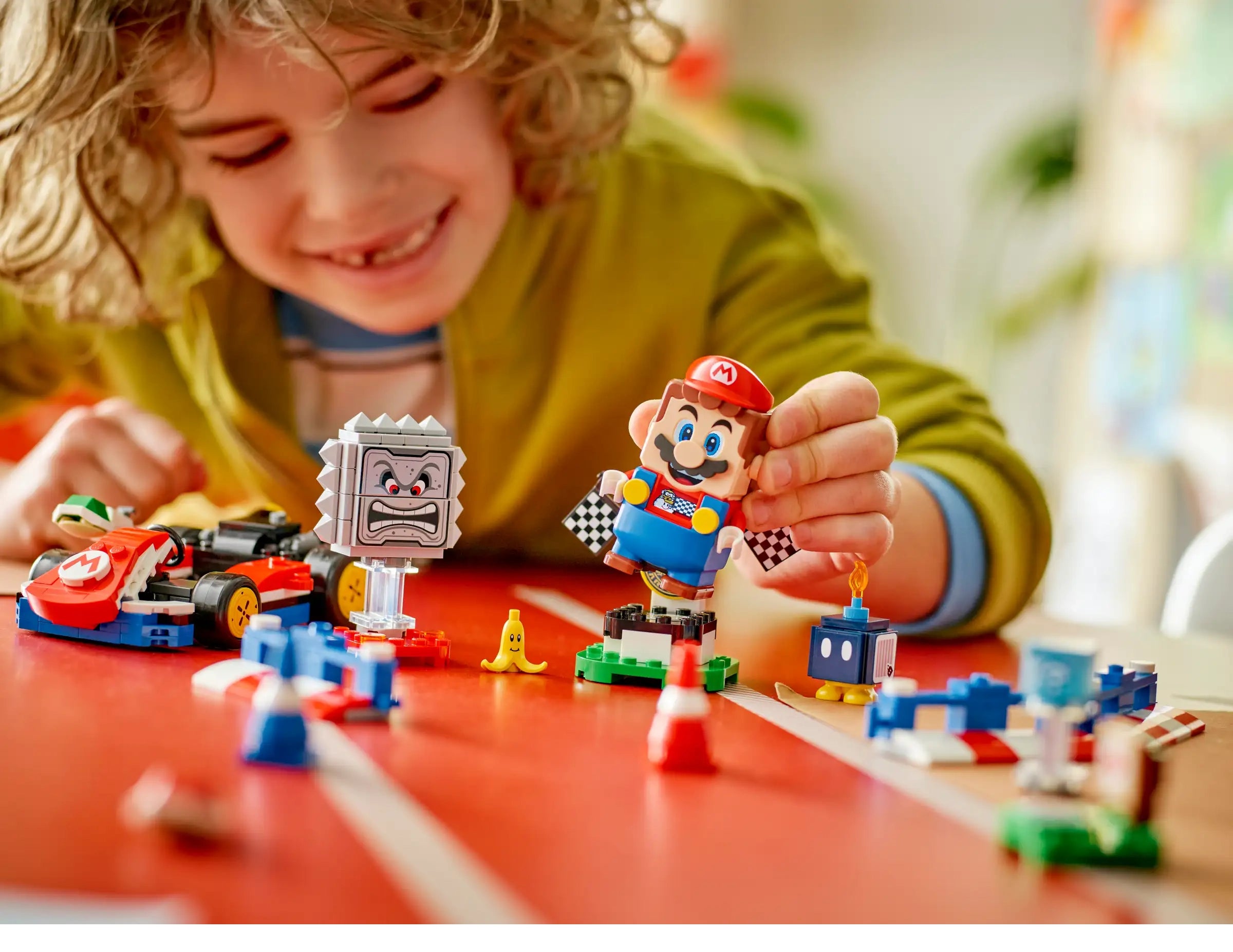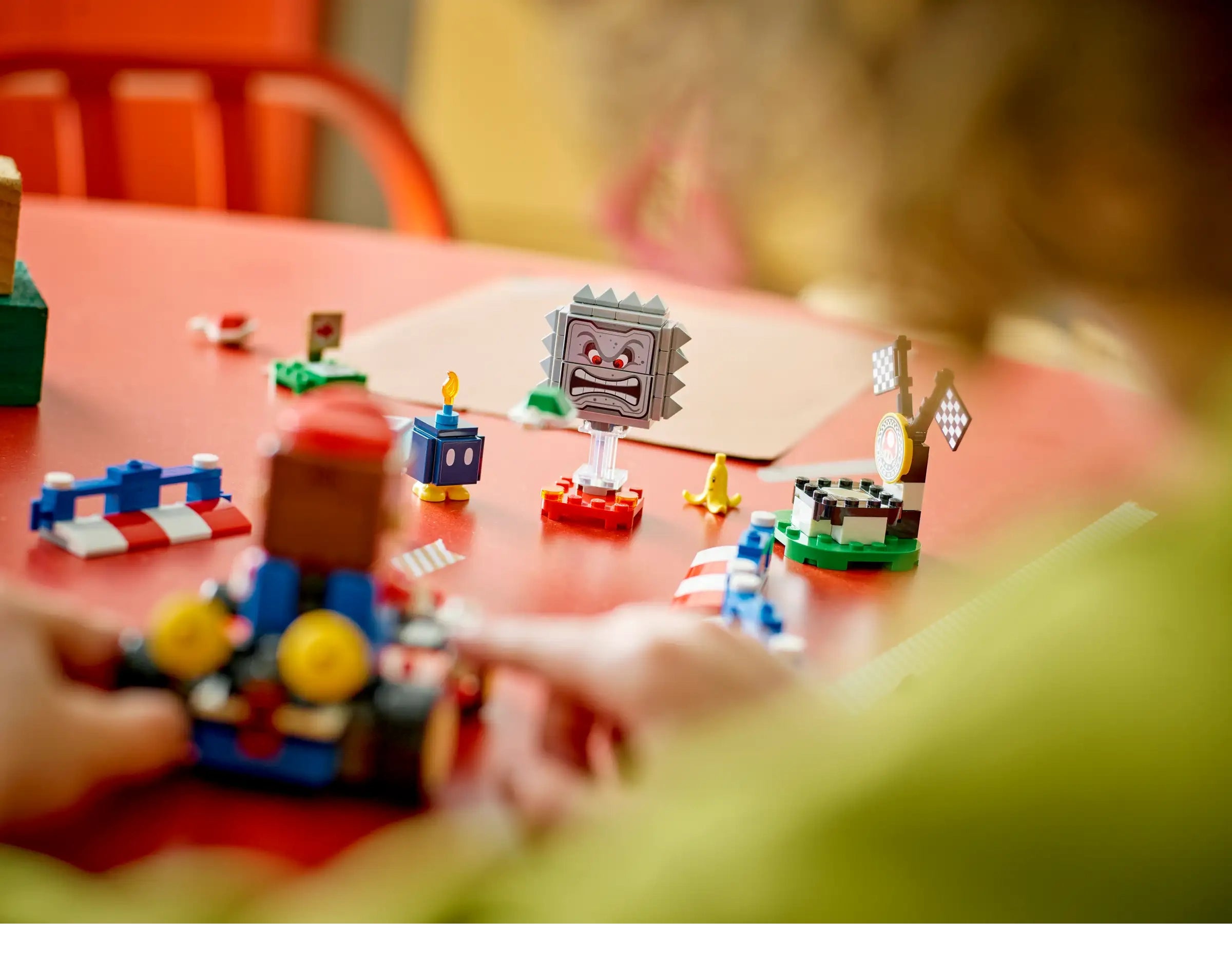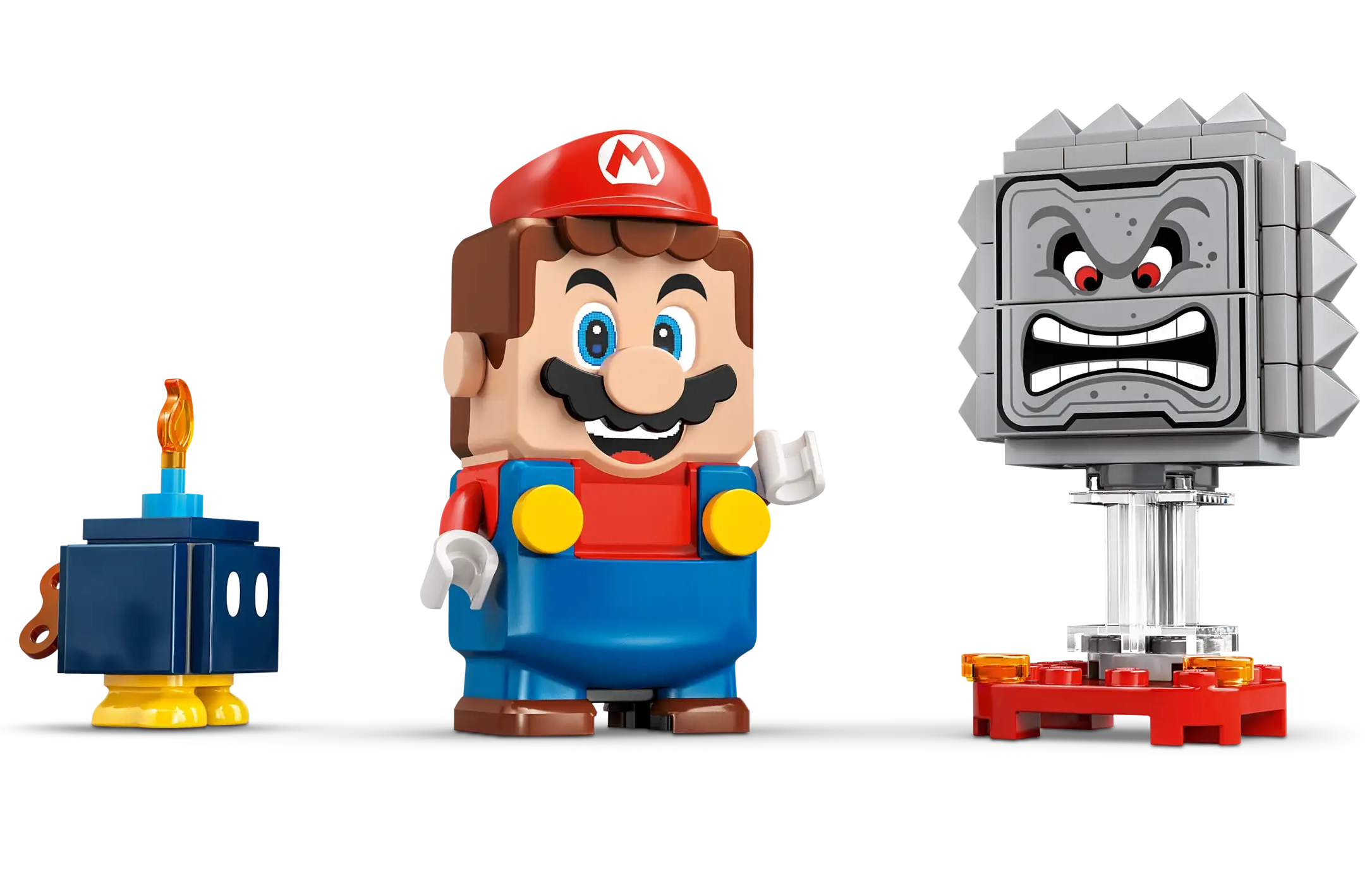 • 3 LEGO® Super Mario™ toy figures – An interactive LEGO® Mario™ figure, Bob-omb and Thwomp figures, plus a Banana element with face decoration
