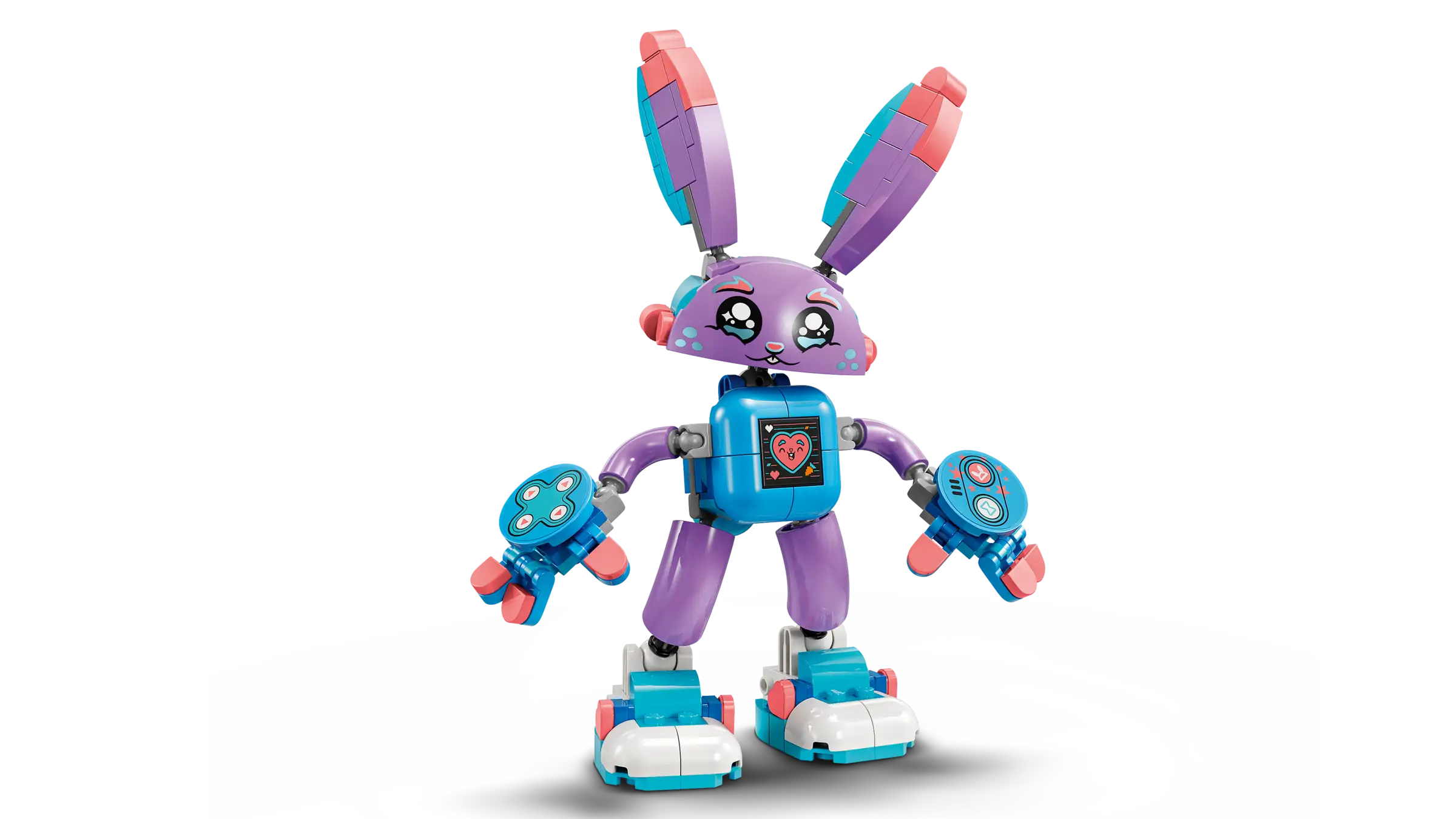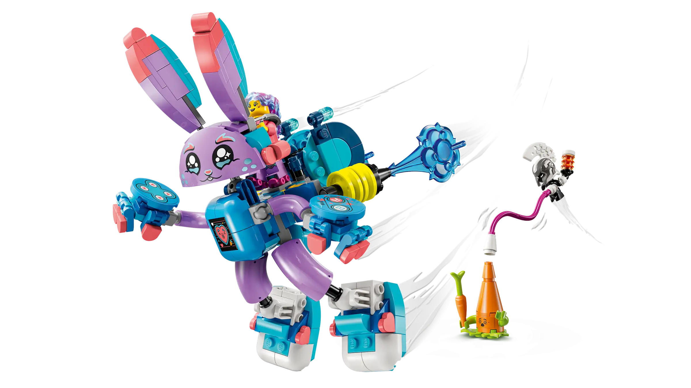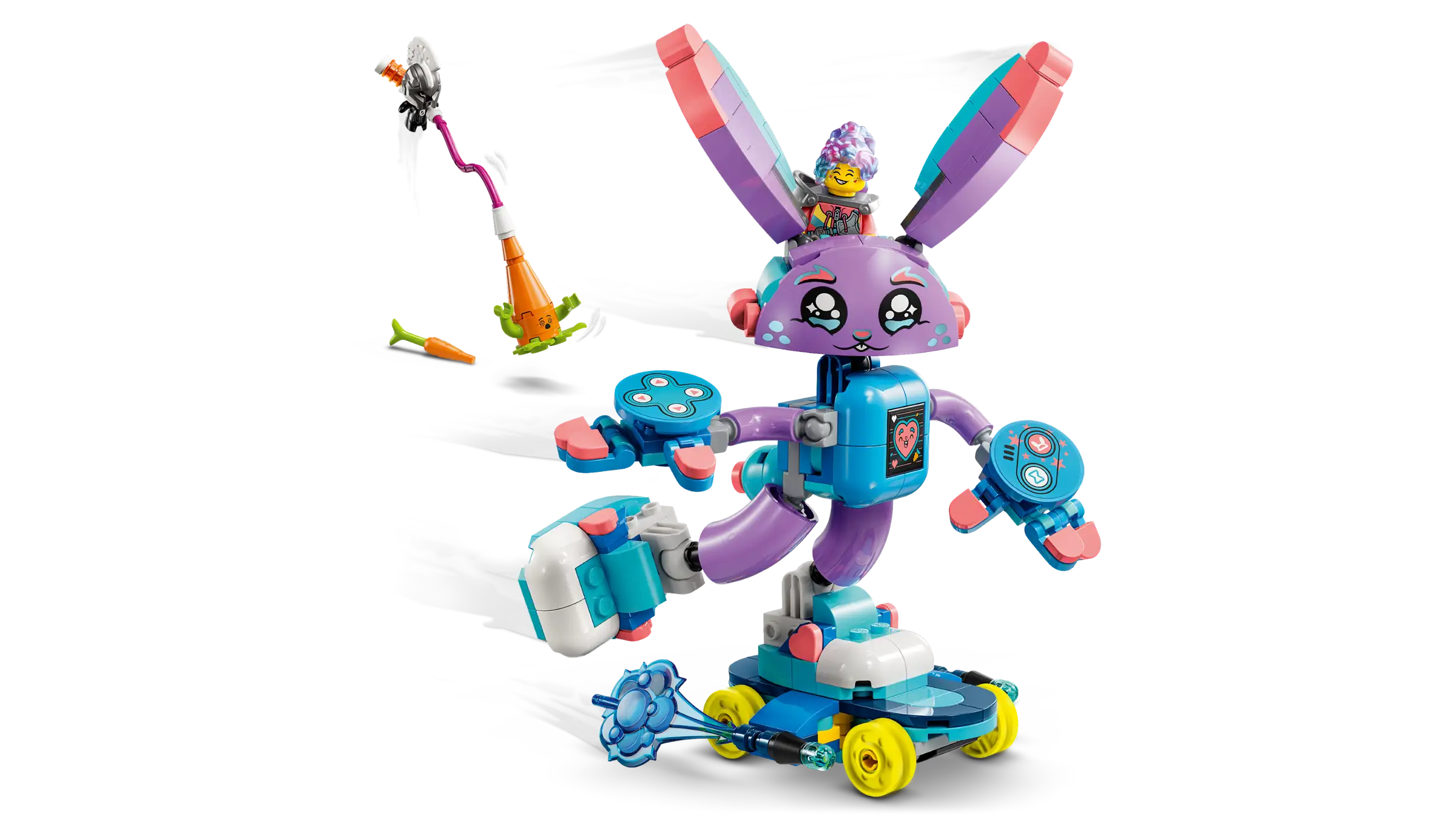 Young dreamers will have fun building the Bunchurro figure, a cool new version of Bunchu the Bunny that has a video game screen on its belly and wears gaming controller gloves and sneakers, before discovering 2 ways to transform it. They can accessorize the rabbit model with a skateboard and boosters or an awesome jetpack. The toy rabbit is highly posable in all modes, and the action is brought to life by an Izzie minifigure, who attaches to the back of Bunchurro to encourage imaginative role play.