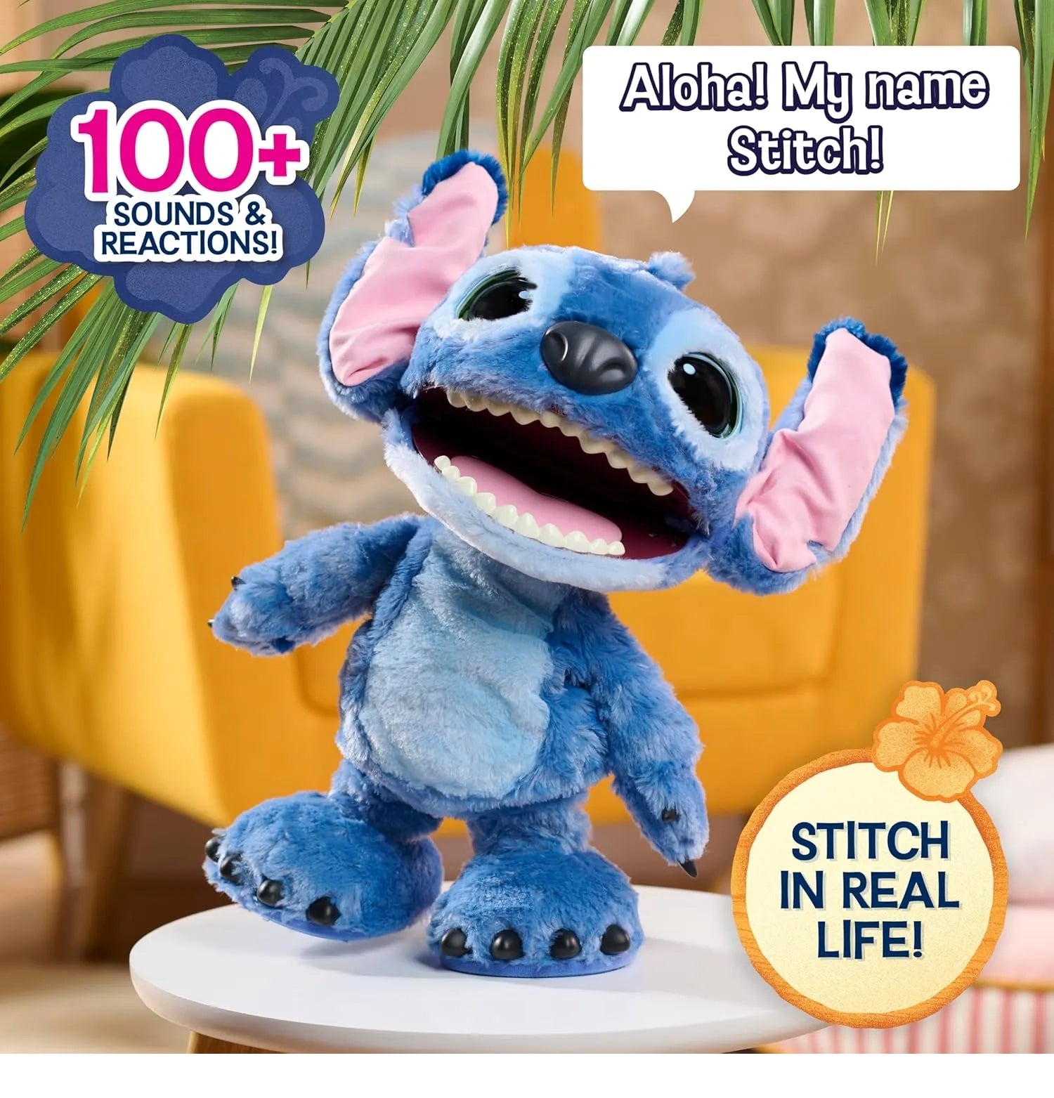 • Feisty Alien Attitude: Double-tap his nose or belly to witness Stitch's legendary tantrums, featuring snarls, growls, and rambunctious gibberish. Press and hold his hand to calm him down when he gets too rowdy.