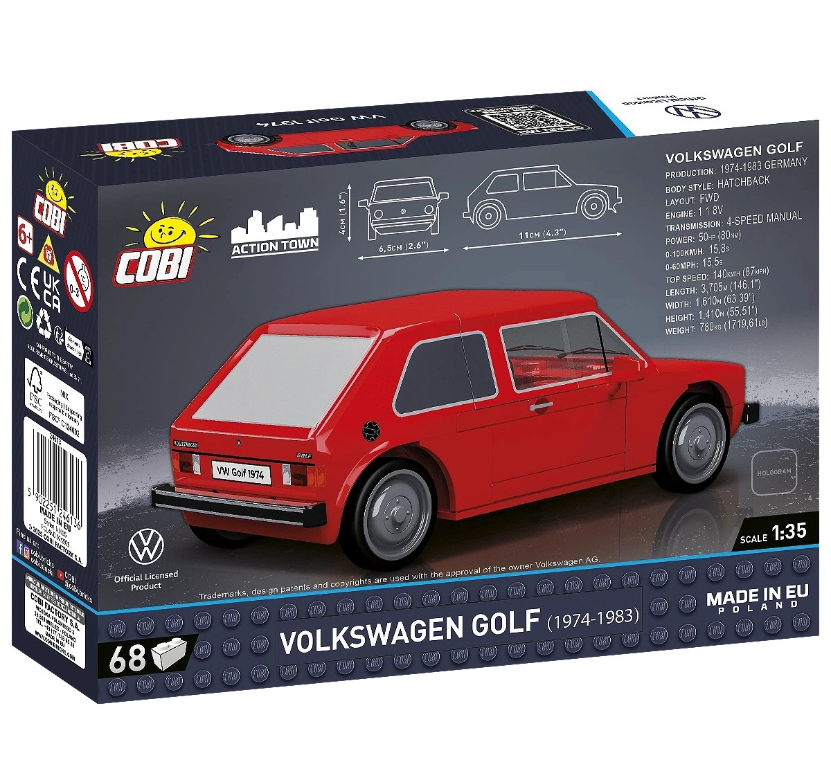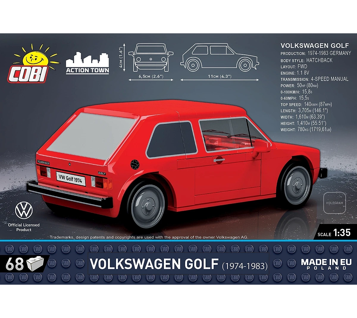 The VOLKSWAGEN GOLF (1974-1983) set from COBI in a 1:35 scale allows you to construct a model of a car that revolutionized the automotive industry in the 1970s and took over the legacy of the famous Beetle, which for decades won the hearts of drivers around the world.