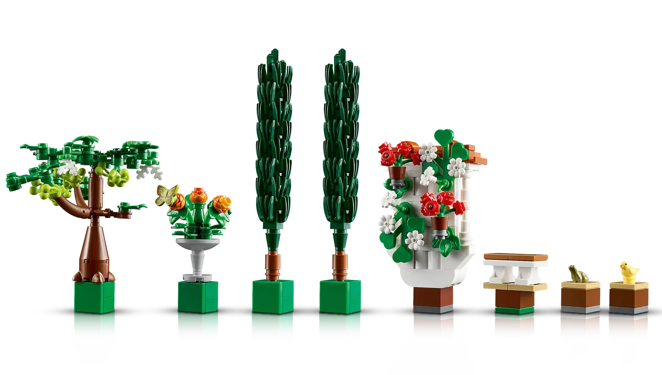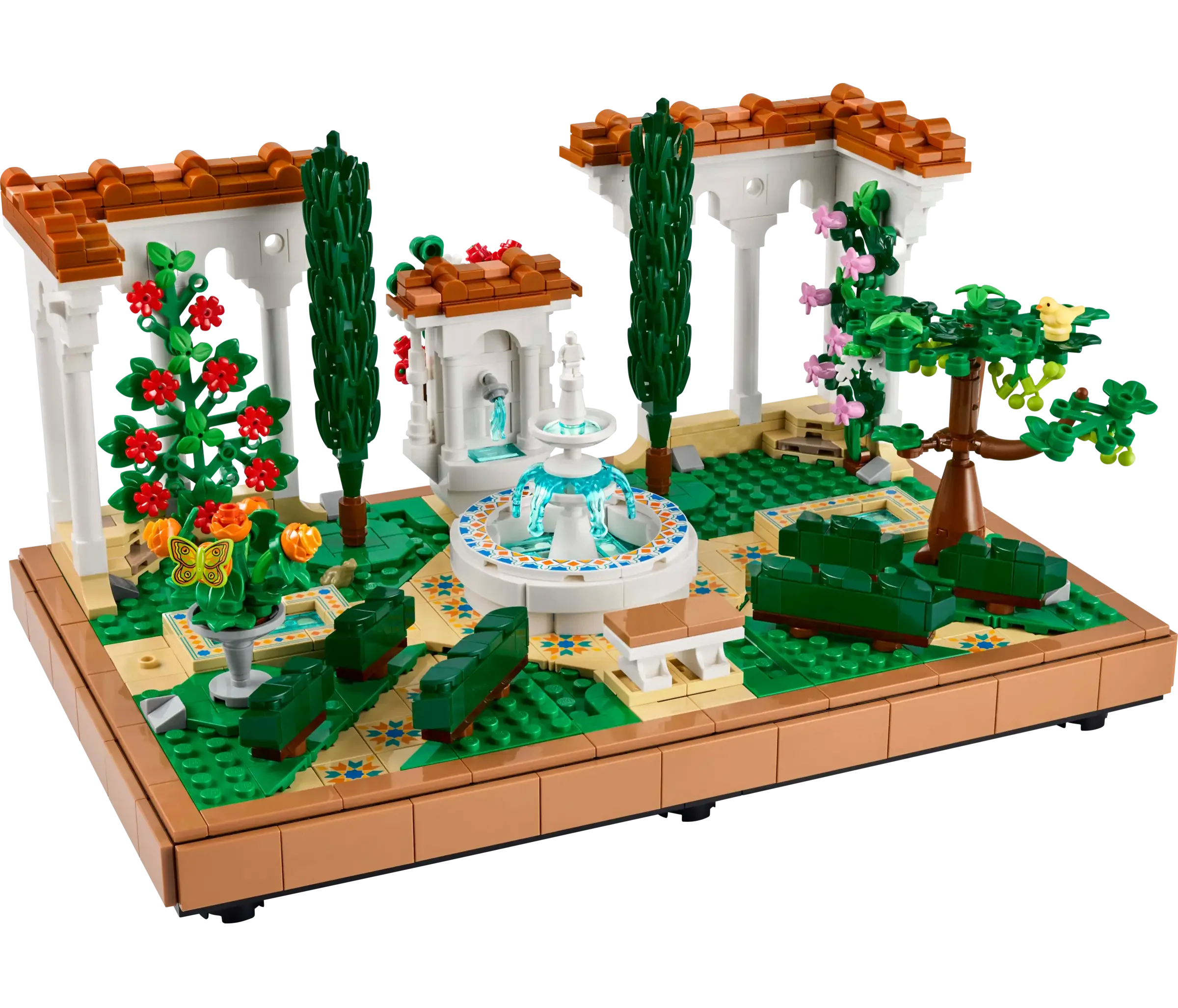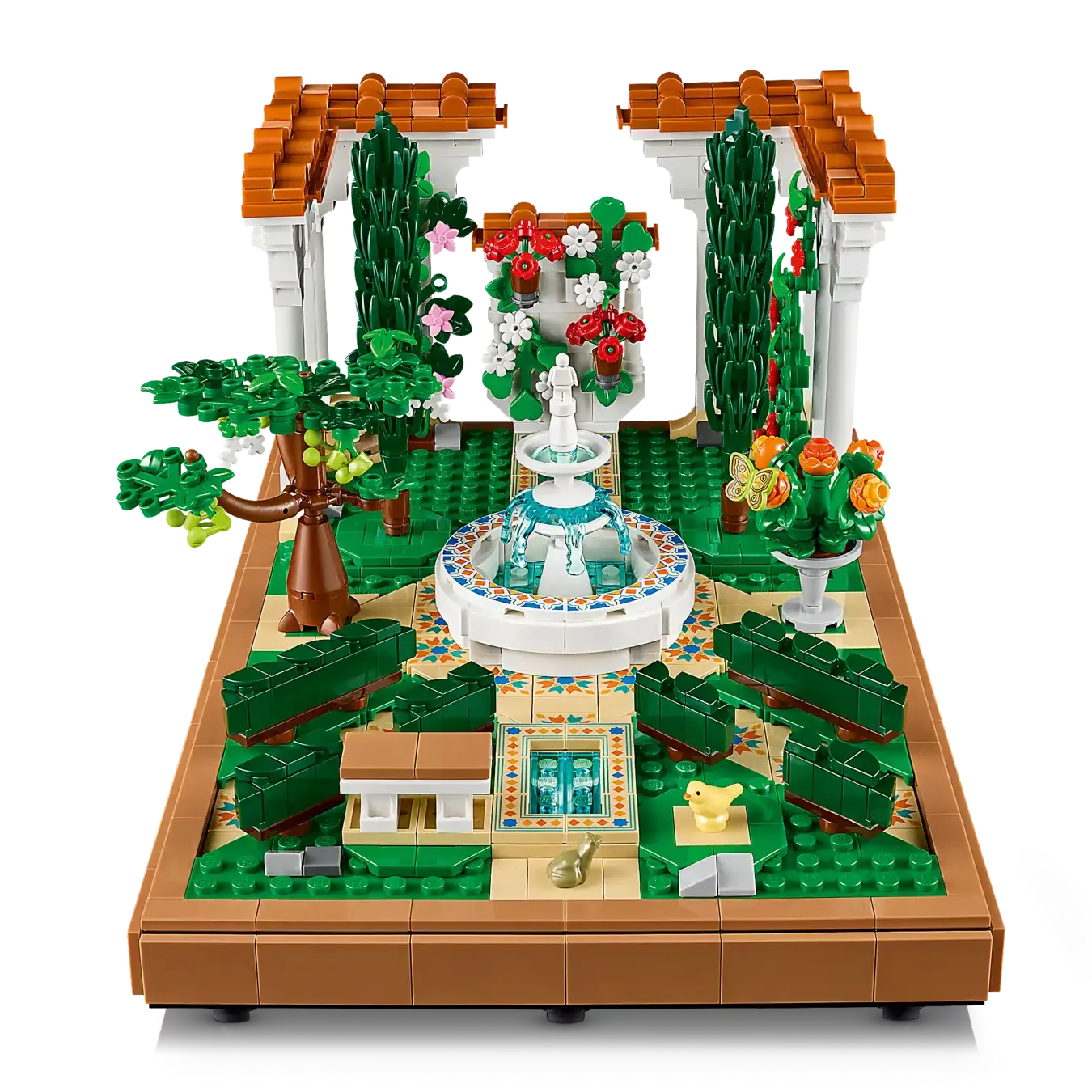 • What’s in the box – The LEGO® Fountain Garden features a tiered fountain, lavabo, 2 cypress trees, flowering grape vines, 4 pergolas and tiled pathways, plus luna moth, bird, and frog figures